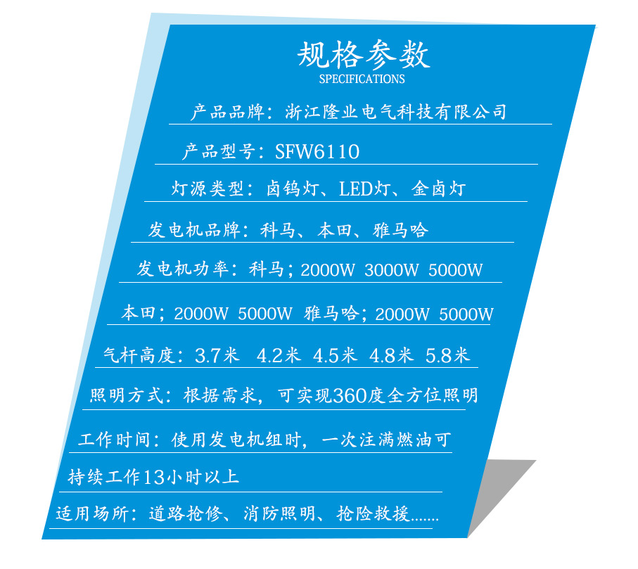 ● 总体灯具远近做到,灯具透明度高、条件大。备选3节伸降缸是 举升转换方式方法,更大飘向极高为4.5米;横竖扭动灯头可转换点光射进来的角立场,灯光照明系统涉及表面积达到了45-65米。可间接安全使用并网发减速机输电,也可连通220V市电长时灯具;